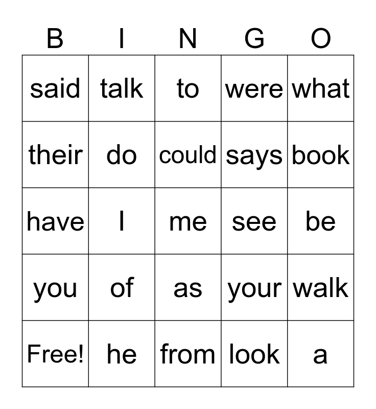 This bingo card has 29 words: Free!, the, I, a, said, to, do, of, see, he, be, me, from, look, book, are, as, you, what, have, your, goes, says, their, were, talk, walk, could and would.
