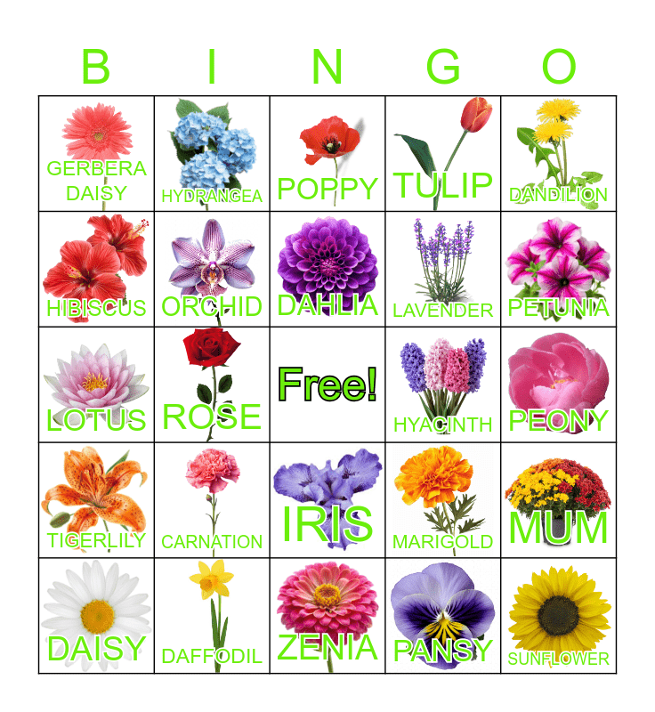 This bingo card has 24 images, a free space and 24 words: CARNATION, DAFFODIL, DAHLIA, DAISY, DANDILION, GERBERA DAISY, HIBISCUS, HYDRANGEA, HYACINTH, IRIS, LAVENDER, LOTUS, MARIGOLD, MUM, ORCHID, PANSY, PEONY, POPPY, PETUNIA, ROSE, SUNFLOWER, TIGERLILY, TULIP and ZENIA.