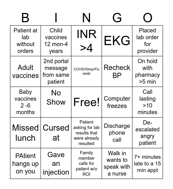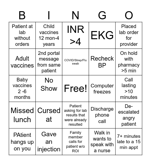 This bingo card has a free space and 29 words: PAtient hangs up on you, Completely out of refills on controlled med, No Show, Scheduled a patient, Patient at lab without orders, INR >4, 2nd portal message from same patient, Cursed at, Computer freezes, Gave an injection, Call lasting >10 minutes, 7+ minutes late to a 15 min appt, Family member calls for patient w/o ROI, Walk in wants to speak with a nurse, On hold with pharmacy >5 min, Home health fiasco, Patient asking for lab results that were already resulted, Missed lunch, Placed lab order for provider, Baby vaccines 2 -6 months, Discharge phone call, Called patient with lab results, Recheck BP, Adult vaccines, EKG, Child vaccines 12 mon-4 years, De-escalated angry patient, COVID/Strep/Flu swab and Complete PA.