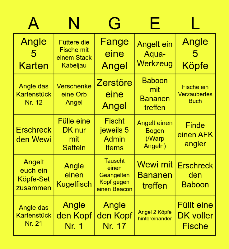 This bingo card has a free space and 24 words: Angle einen Kugelfisch, Angle den Kopf Nr. 1, Zerstöre eine Angel, Angle das Kartenstück Nr. 21, Angle 5 Köpfe, Angle 5 Karten, Angle das Kartenstück Nr. 12, Füttere die Fische mit einem Stack Kabeljau, Angelt einen Bogen (/Warp Angeln), Tauscht einen Geangelten Kopf gegen einen Beacon, Baboon mit Bananen treffen, Erschreck den Wewi, Wewi mit Bananen treffen, Erschreck den Baboon, Verschenke eine Orb Angel, Angel 2 Köpfe hintereinander, Finde einen AFK angler, Fange eine Angel, Fische ein Verzaubertes Buch, Fülle eine DK nur mit Satteln, Füllt eine DK voller Fische, Angelt euch ein Köpfe-Set zusammen, Angelt ein Aqua-Werkzeug and Angle den Kopf Nr. 17.