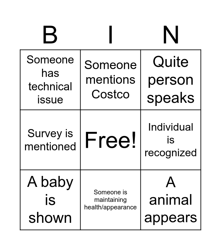 This bingo card has a free space and 8 words: Individual is recognized, Quite person speaks, Someone mentions Costco, A baby is shown, Someone has technical issue, A animal appears, Survey is mentioned and Someone is maintaining health/appearance.