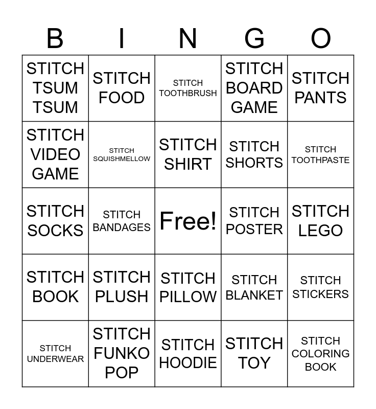 This bingo card has a free space and 24 words: STITCH PLUSH, STITCH FUNKO POP, STITCH SHIRT, STITCH UNDERWEAR, STITCH PANTS, STITCH TSUM TSUM, STITCH VIDEO GAME, STITCH FOOD, STITCH POSTER, STITCH PILLOW, STITCH SHORTS, STITCH SOCKS, STITCH BLANKET, STITCH STICKERS, STITCH SQUISHMELLOW, STITCH TOY, STITCH LEGO, STITCH TOOTHBRUSH, STITCH TOOTHPASTE, STITCH BANDAGES, STITCH COLORING BOOK, STITCH BOOK, STITCH BOARD GAME and STITCH HOODIE.