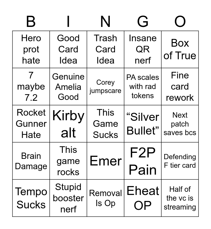 This bingo card has a free space and 24 words: This game rocks, Stupid booster nerf, Corey jumpscare, Tempo Sucks, Box of True, Hero prot hate, 7 maybe 7.2, Good Card Idea, “Silver Bullet”, Emer, PA scales with rad tokens, Rocket Gunner Hate, F2P Pain, Defending F tier card, Genuine Amelia Good, Eheat OP, Next patch saves bcs, Trash Card Idea, Fine card rework, Kirby alt, Half of the vc is streaming, Brain Damage, Insane QR nerf and Removal Is Op.