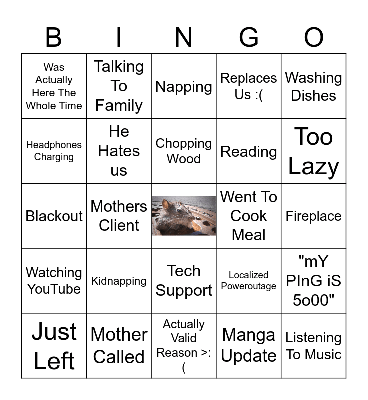 This bingo card has a free space and 24 words: Kidnapping, Mother Called, Chopping Wood, Just Left, Washing Dishes, Was Actually Here The Whole Time, Headphones Charging, Talking To Family, Went To Cook Meal, Tech Support, Reading, Blackout, Localized Poweroutage, "mY PInG iS 5o00", He Hates us, Manga Update, Fireplace, Napping, Too Lazy, Mothers Client, Listening To Music, Watching YouTube, Replaces Us :( and Actually Valid Reason >:(.
