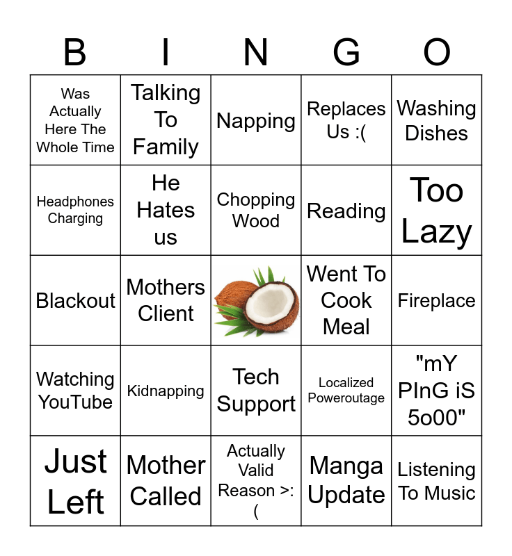 This bingo card has a free space and 24 words: Kidnapping, Mother Called, Chopping Wood, Just Left, Washing Dishes, Was Actually Here The Whole Time, Headphones Charging, Talking To Family, Went To Cook Meal, Tech Support, Reading, Blackout, Localized Poweroutage, "mY PInG iS 5o00", He Hates us, Manga Update, Fireplace, Napping, Too Lazy, Mothers Client, Listening To Music, Watching YouTube, Replaces Us :( and Actually Valid Reason >:(.