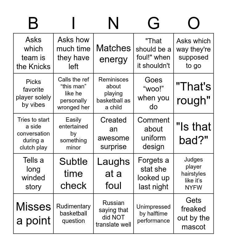 This bingo card has a free space and 24 words: Subtle time check, Rudimentary basketball question, Reminisces about playing basketball as a child, Misses a point, Asks which way they're supposed to go, Asks which team is the Knicks, Picks favorite player solely by vibes, Asks how much time they have left, Comment about uniform design, Laughs at a foul, Goes “woo!” when you do, Tries to start a side conversation during a clutch play, Forgets a stat she looked up last night, Judges player hairstyles like it’s NYFW, Calls the ref “this man” like he personally wronged her, Unimpressed by halftime performance, "Is that bad?", Matches energy, "That's rough", Easily entertained by something minor, Gets freaked out by the mascot, Tells a long winded story, "That should be a foul!" when it shouldn't and Russian saying that did NOT translate well.