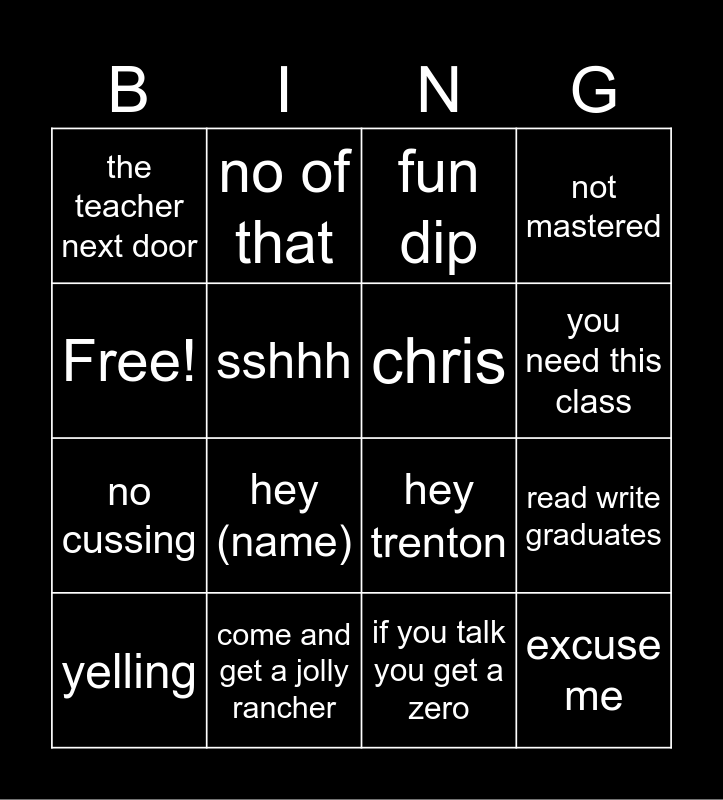 This bingo card has 16 words: come and get a jolly rancher, read write graduates, fun dip, the teacher next door, no cussing, no of that, hey trenton, if you talk you get a zero, Free!, sshhh, yelling, not mastered, hey (name), you need this class, chris and excuse me.