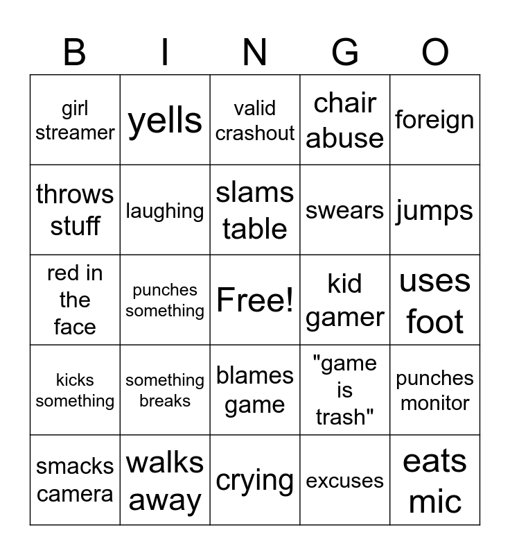 This bingo card has a free space and 24 words: something breaks, walks away, slams table, smacks camera, foreign, girl streamer, throws stuff, yells, kid gamer, blames game, swears, red in the face, "game is trash", punches monitor, laughing, excuses, uses foot, valid crashout, jumps, punches something, eats mic, kicks something, chair abuse and crying.