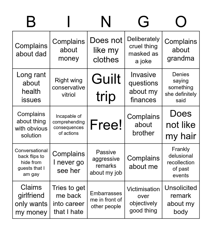 This bingo card has a free space and 24 words: Complains I never go see her, Tries to get me back into career that I hate, Guilt trip, Claims girlfriend only wants my money, Complains about grandma, Complains about dad, Long rant about health issues, Complains about money, Complains about brother, Passive aggressive remarks about my job, Invasive questions about my finances, Complains about thing with obvious solution, Complains about me, Frankly delusional recollection of past events, Right wing conservative vitriol, Victimisation over objectively good thing, Does not like my hair, Does not like my clothes, Denies saying something she definitely said, Incapable of comprehending consequences of actions, Unsolicited remark about my body, Conversational back flips to hide from guests that I am gay, Deliberately cruel thing masked as a joke and Embarrasses me in front of other people.