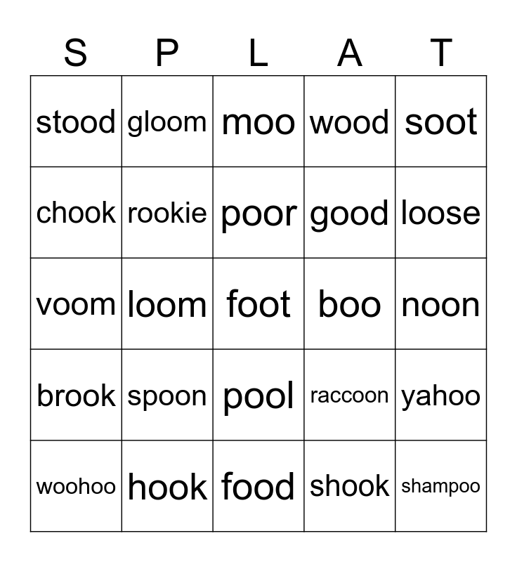 This bingo card has 59 words: crook, hook, look, brook, shook, nook, rookie, took, good, hood, wood, wool, chook, book, cook, stood, foot, soot, hoop, poor, boo, moo, woohoo, yahoo, shoo, too, cartoon, soon, loose, choo choo, zoo, tools, broom, bloom, gloom, doom, groom, loom, room, voom, zoom, spoon, noon, moon, moose, root, goose, boot, pool, food, baboon, mood, poodle, Google, doodle, raccoon, monsoon, shampoo and bamboo.