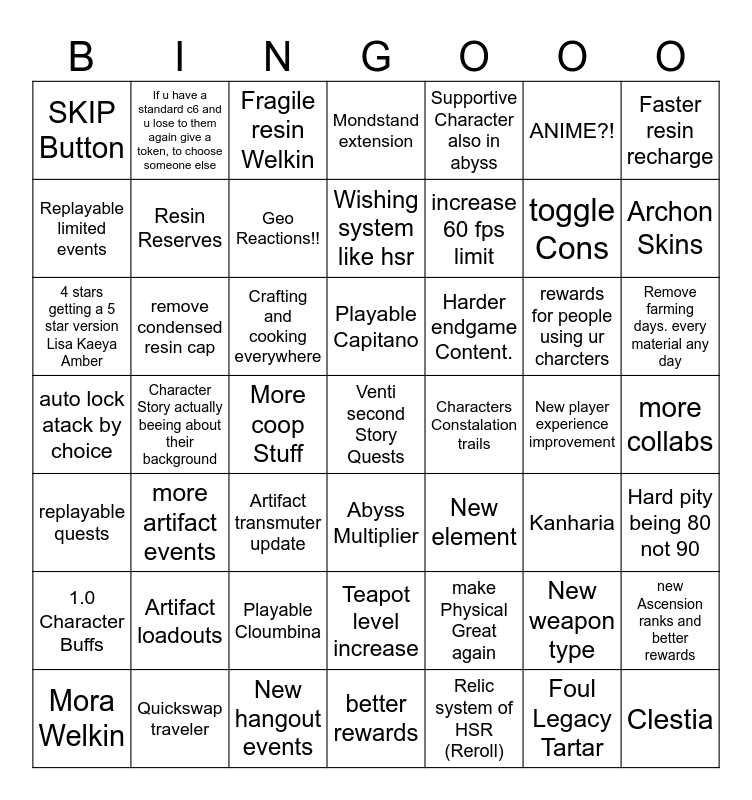 This bingo card has 49 words: 1.0 Character Buffs, remove condensed resin cap, Playable Cloumbina, Abyss Multiplier, Harder endgame Content., New player experience improvement, Faster resin recharge, Mora Welkin, Resin Reserves, More coop Stuff, Wishing system like hsr, Supportive Character also in abyss, toggle Cons, Remove farming days. every material any day, replayable quests, more artifact events, Fragile resin Welkin, Playable Capitano, Relic system of HSR (Reroll), ANIME?!, Archon Skins, Replayable limited events, If u have a standard c6 and u lose to them again give a token, to choose someone else, Geo Reactions!!, better rewards, increase 60 fps limit, rewards for people using ur charcters, new Ascension ranks and better rewards, SKIP Button, Character Story actually beeing about their background, New hangout events, Teapot level increase, New element, New weapon type, more collabs, auto lock atack by choice, Artifact loadouts, Artifact transmuter update, Venti second Story Quests, Characters Constalation trails, Foul Legacy Tartar, Hard pity being 80 not 90, 4 stars getting a 5 star version Lisa Kaeya Amber, Quickswap traveler, Crafting and cooking everywhere, Mondstand extension, make Physical Great again, Kanharia and Clestia.