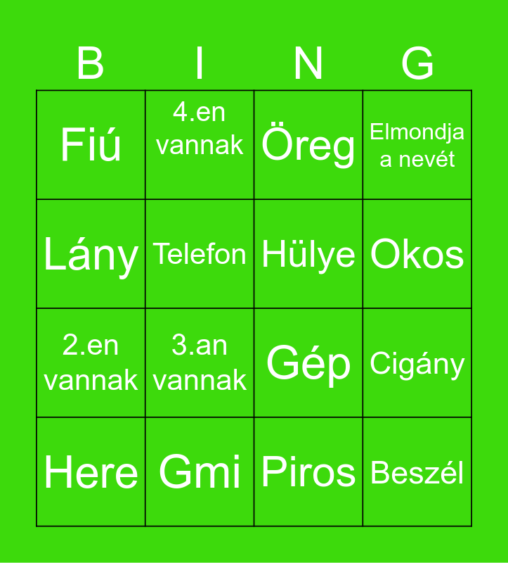 This bingo card has 20 words: Cigány, Fiatal, Öreg, Gyerek, Here, Lány, Gmi, Fiú, 2.en vannak, 4.en vannak, 3.an vannak, Gép, Telefon, Beszél, Hülye, Kék pólós, Okos, Elmondja a nevét, Piros and Rózsaszín.