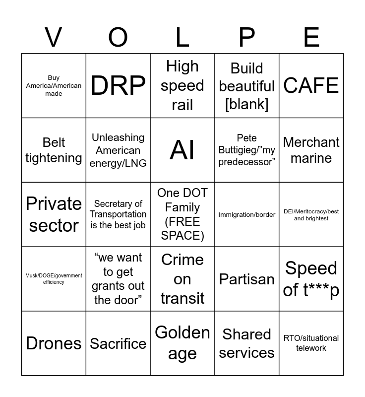This bingo card has a free space and 37 words: Dress code/Flip flops/suits, Marriage, birth, child, Air safety/traffic control, Unleashing American energy/LNG, Speed of t***p, “we want to get grants out the door”, AI, Automation, CAFE, Vehicle prices/manufacturing, Secretary of Transportation is the best job, Build beautiful [blank], RTO/situational telework, DEI/Meritocracy/best and brightest, Belt tightening, Musk/DOGE/government efficiency, Congestion pricing, High speed rail, Crime on transit, Immigration/border, Buy America/American made, Merchant marine, Drones, Golden age, Tariffs, Shared services, DRP, RIF, Other government agencies bossing around DOT/Volpe (e.g., GSA & OPM), Volpe, White House and its inhabitants, Sacrifice, Private sector, Highway trust fund/Reauthorization, Partisan, Pete Buttigieg/”my predecessor” and Fox News.