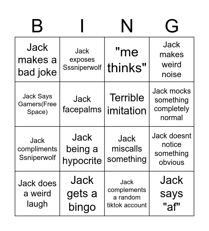 This bingo card has 16 words: Jack gets a bingo, Jack doesnt notice something obvious, "me thinks", Jack makes a bad joke, Jack compliments Ssniperwolf, Jack exposes Sssniperwolf, Jack miscalls something, Jack complements a random tiktok account, Jack Says Gamers(Free Space), Jack facepalms, Jack does a weird laugh, Jack makes weird noise, Jack being a hypocrite, Jack mocks something completely normal, Terrible imitation and Jack says "af".