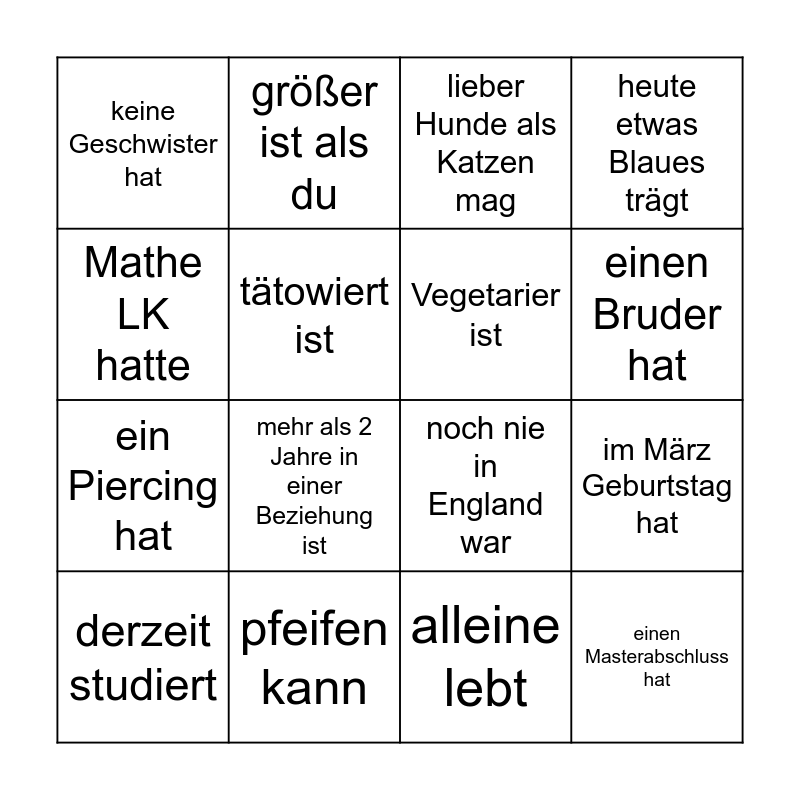 This bingo card has 17 words: alleine lebt, derzeit studiert, lieber Hunde als Katzen mag, keine Geschwister hat, mehr als 2 Jahre in einer Beziehung ist, heute etwas Blaues trägt, im März Geburtstag hat, Vegetarier ist, einen Bruder hat, tätowiert ist, pfeifen kann, noch nie in England war, Mathe LK hatte, größer ist als du, ein Piercing hat, Langschläfer ist and einen Masterabschluss hat.