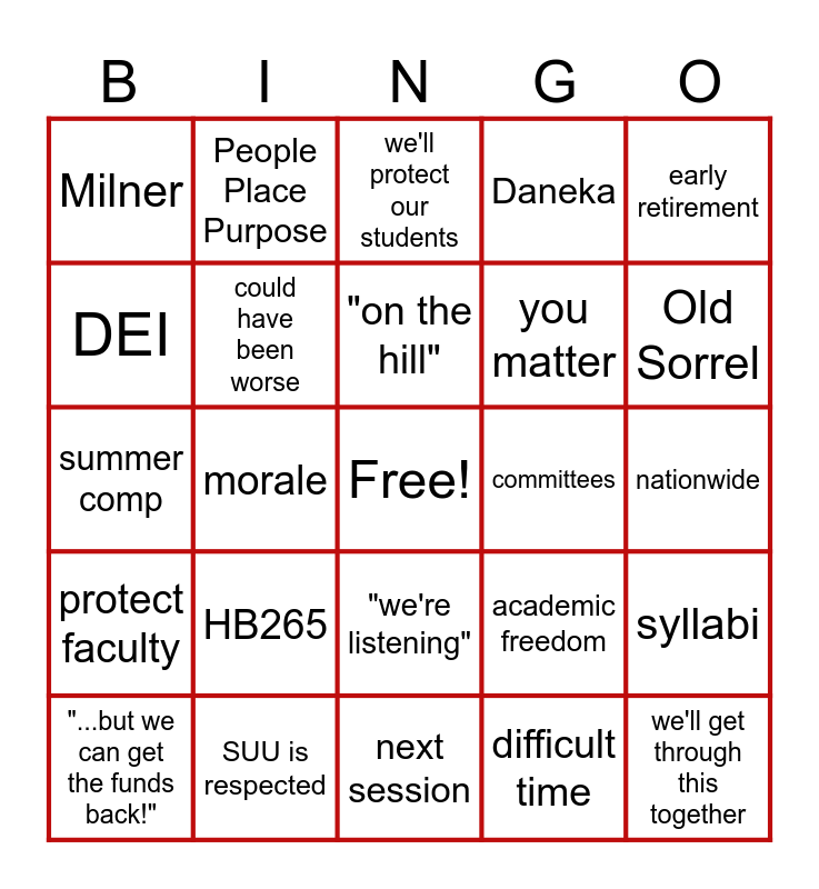 This bingo card has a free space and 24 words: HB265, SUU is respected, "on the hill", "...but we can get the funds back!", early retirement, Milner, DEI, People Place Purpose, committees, "we're listening", you matter, summer comp, academic freedom, syllabi, could have been worse, difficult time, nationwide, we'll protect our students, Old Sorrel, morale, we'll get through this together, protect faculty, Daneka and next session.