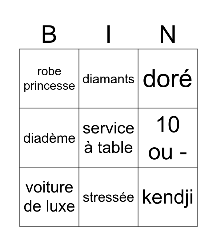This bingo card has a free space and 8 words: 10 ou -, doré, diamants, voiture de luxe, robe princesse, kendji, diadème and stressée.