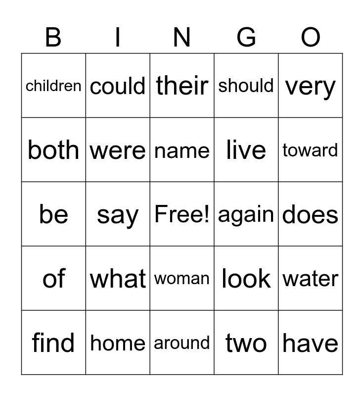 This bingo card has a free space and 24 words: what, home, name, find, very, children, both, could, again, woman, live, be, look, water, were, two, does, their, toward, say, have, of, should and around.