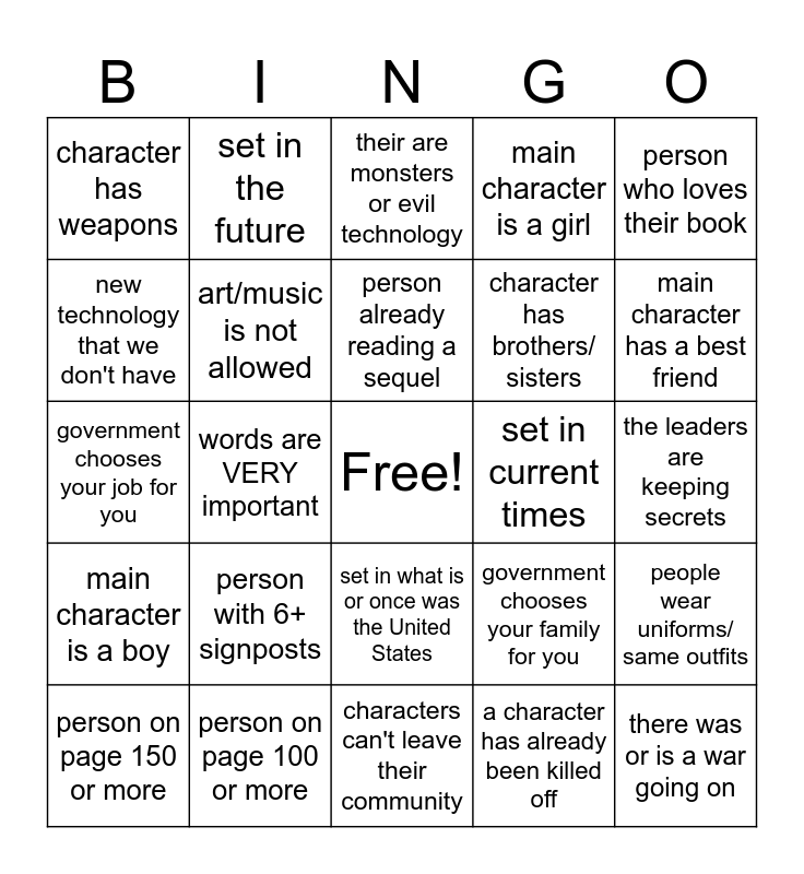 This bingo card has a free space and 24 words: person with 6+ signposts, person on page 100 or more, person already reading a sequel, person on page 150 or more, person who loves their book, character has weapons, new technology that we don't have, set in the future, set in current times, set in what is or once was the United States, character has brothers/ sisters, government chooses your job for you, government chooses your family for you, people wear uniforms/ same outfits, art/music is not allowed, a character has already been killed off, the leaders are keeping secrets, their are monsters or evil technology, main character has a best friend, words are VERY important, there was or is a war going on, main character is a boy, main character is a girl and characters can't leave their community.