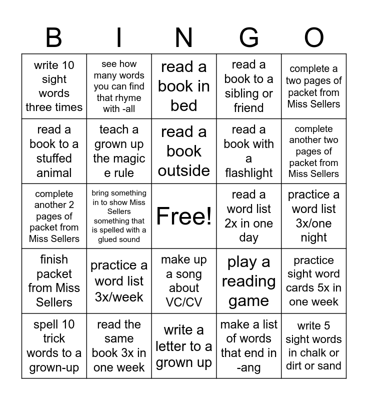 This bingo card has a free space and 24 words: practice a word list 3x/week, read the same book 3x in one week, read a book outside, spell 10 trick words to a grown-up, complete a two pages of packet from Miss Sellers, write 10 sight words three times, read a book to a stuffed animal, see how many words you can find that rhyme with -all, read a word list 2x in one day, make up a song about VC/CV, read a book with a flashlight, complete another 2 pages of packet from Miss Sellers, play a reading game, practice sight word cards 5x in one week, teach a grown up the magic e rule, make a list of words that end in -ang, practice a word list 3x/one night, read a book in bed, complete another two pages of packet from Miss Sellers, bring something in to show Miss Sellers something that is spelled with a glued sound, write 5 sight words in chalk or dirt or sand, finish packet from Miss Sellers, read a book to a sibling or friend and write a letter to a grown up.