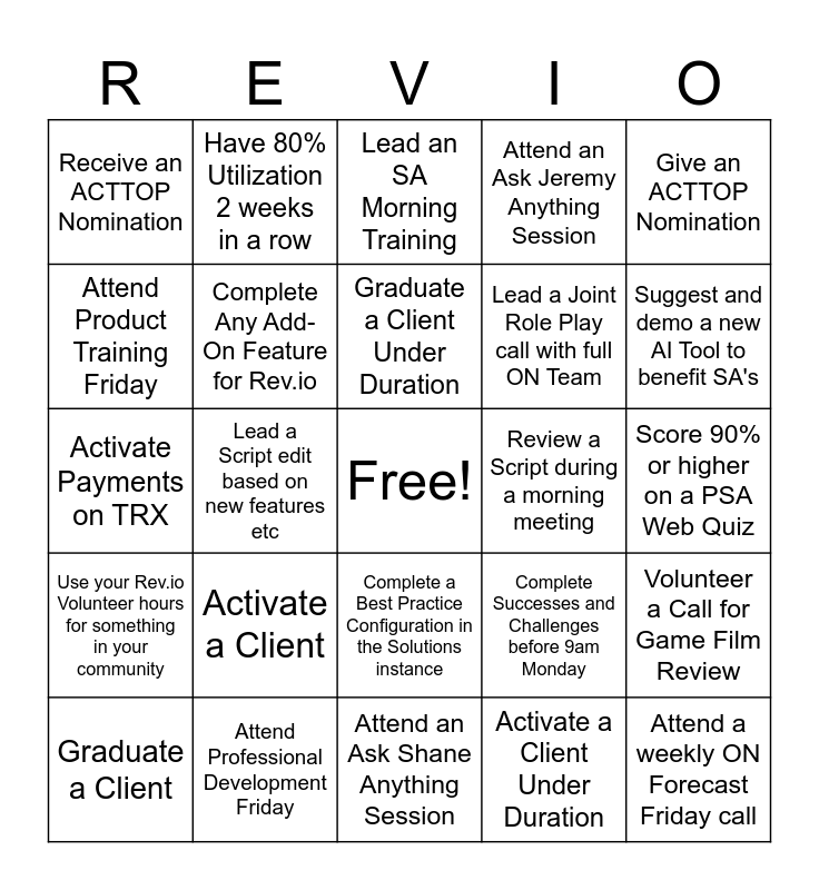 This bingo card has a free space and 24 words: Graduate a Client, Activate a Client, Graduate a Client Under Duration, Activate a Client Under Duration, Give an ACTTOP Nomination, Receive an ACTTOP Nomination, Have 80% Utilization 2 weeks in a row, Lead an SA Morning Training, Review a Script during a morning meeting, Score 90% or higher on a PSA Web Quiz, Activate Payments on TRX, Complete Any Add-On Feature for Rev.io, Complete Successes and Challenges before 9am Monday, Volunteer a Call for Game Film Review, Attend Product Training Friday, Attend Professional Development Friday, Attend an Ask Shane Anything Session, Attend an Ask Jeremy Anything Session, Suggest and demo a new AI Tool to benefit SA's, Use your Rev.io Volunteer hours for something in your community, Lead a Script edit based on new features etc, Complete a Best Practice Configuration in the Solutions instance, Lead a Joint Role Play call with full ON Team and Attend a weekly ON Forecast Friday call.