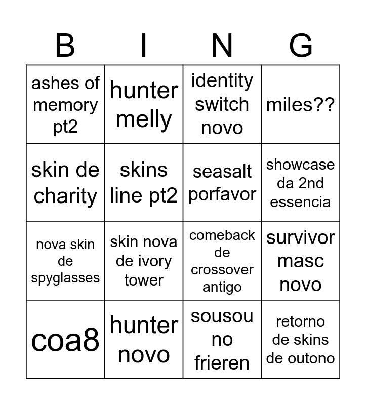 This bingo card has 16 words: hunter novo, survivor masc novo, identity switch novo, ashes of memory pt2, nova skin de spyglasses, hunter melly, comeback de crossover antigo, sousou no frieren, skin de charity, skins line pt2, coa8, miles??, skin nova de ivory tower, showcase da 2nd essencia, seasalt porfavor and retorno de skins de outono.