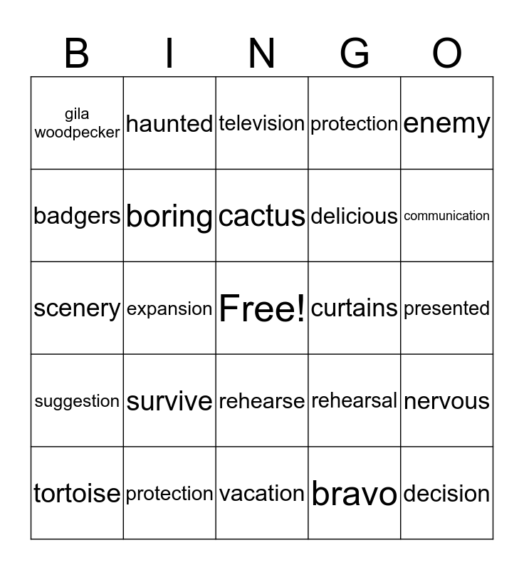 This bingo card has a free space and 24 words: survive, protection, cactus, tortoise, enemy, gila woodpecker, badgers, haunted, curtains, rehearse, delicious, scenery, rehearsal, nervous, boring, bravo, presented, television, communication, expansion, decision, suggestion, protection and vacation.