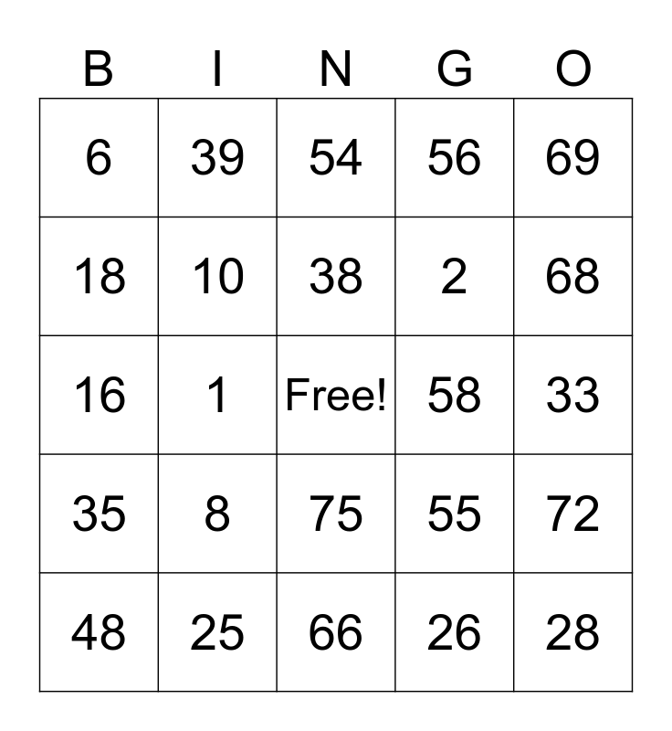 This bingo card has a free space and 24 words: 8, 25, 38, 48, 69, 6, 18, 39, 58, 75, 2, 16, 55, 72, 10, 26, 33, 54, 68, 1, 28, 35, 56 and 66.