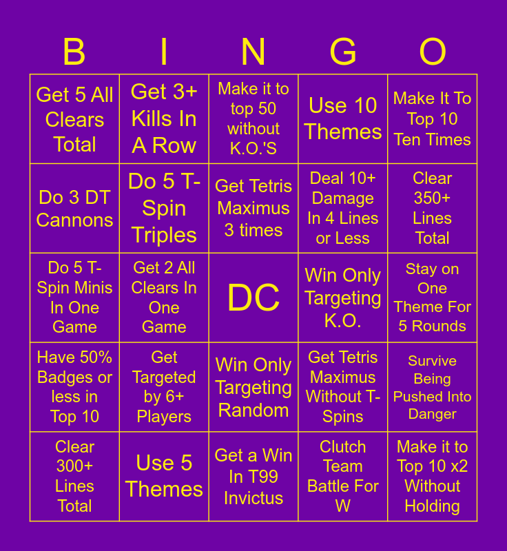 This bingo card has a free space and 24 words: Get Targeted by 6+ Players, Use 5 Themes, Get Tetris Maximus 3 times, Clear 300+ Lines Total, Make It To Top 10 Ten Times, Get 5 All Clears Total, Do 3 DT Cannons, Get 3+ Kills In A Row, Win Only Targeting K.O., Win Only Targeting Random, Deal 10+ Damage In 4 Lines or Less, Do 5 T-Spin Minis In One Game, Get Tetris Maximus Without T-Spins, Survive Being Pushed Into Danger, Do 5 T-Spin Triples, Clutch Team Battle For W, Stay on One Theme For 5 Rounds, Make it to top 50 without K.O.'S, Clear 350+ Lines Total, Get 2 All Clears In One Game, Make it to Top 10 x2 Without Holding, Have 50% Badges or less in Top 10, Use 10 Themes and Get a Win In T99 Invictus.