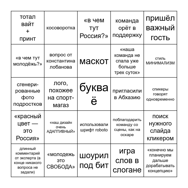 This bingo card has a free space and 24 words: «наш дизайн очень АДАПТИВНЫЙ», «молодежь это СВОБОДА», маскот, длинный комментарий от эксперта (в конце никакого вопроса не задали), пришёл важный гость, тотал вайт + принт, «в чем тут молодёжь?», косоворотка, пригласили в Абхазию, использовали шрифт roboto, «наша команда не спала уже больше трех суток», сгенери-рованные фото подростков, поблагодарить команду со сцены, как на оскаре, поиск нужного слайда кликером, вопрос от константина лобанова, игра слов в слогане, спикеры говорят одновременно, «в чем тут Россия?», стиль МИНИМАЛИЗМ, лого, похожее на спорт-магаз, «конечно мы планируем дальше дорабатывать концепцию», «красный цвет — это Россия», команда орёт в поддержку and шоурил под бит.