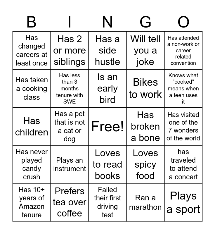 This bingo card has a free space and 29 words: Has 10+ years of Amazon tenure, Fluent in 3+ Languages, Has a pet that is not a cat or dog, Has a unique hobby, Has changed careers at least once, Has a side hustle, Has less than 3 months tenure with SWE, Plays an instrument, Has broken a bone, Prefers tea over coffee, Has visited one of the 7 wonders of the world, Plays a sport, Failed their first driving test, Ran a marathon, Knows what "cooked" means when a teen uses it, Knows sign language, Loves to read books, Has never played candy crush, Has attended a non-work or career related convention, Has children, Loves spicy food, Has a hobby related to art, Bikes to work, Has taken a cooking class, Will tell you a joke, Has 2 or more siblings, has traveled to attend a concert, Is an early bird and Has been to a National Park.