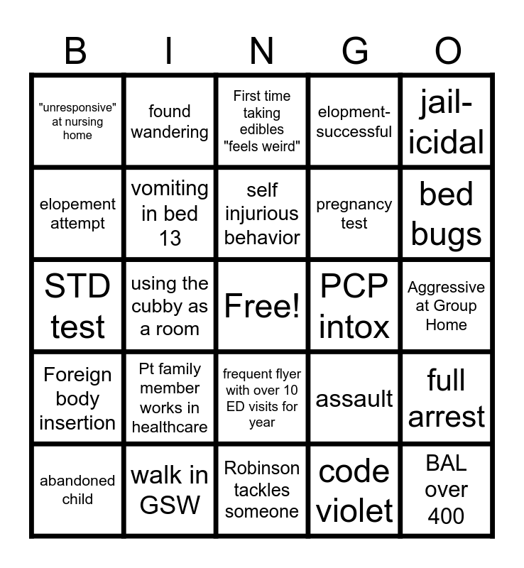 This bingo card has a free space and 24 words: Pt family member works in healthcare, walk in GSW, self injurious behavior, abandoned child, jail-icidal, "unresponsive" at nursing home, elopement attempt, found wandering, PCP intox, frequent flyer with over 10 ED visits for year, pregnancy test, STD test, assault, full arrest, vomiting in bed 13, code violet, Aggressive at Group Home, First time taking edibles "feels weird", bed bugs, using the cubby as a room, BAL over 400, Foreign body insertion, elopment-successful and Robinson tackles someone.