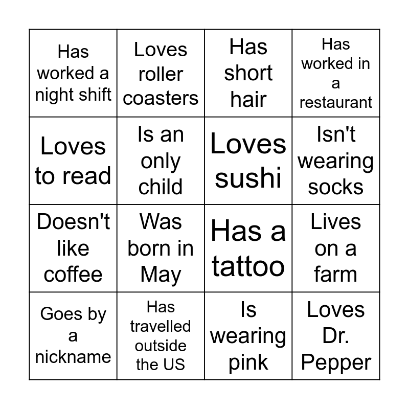 This bingo card has 38 words: Was born at St. Luke's, Was born in another state, Loves winter sports, Loves sushi, Is wearing glasses, Has worked here less than a year, Isn't wearing socks, Is afraid of heights, Loves to read, Doesn't like coffee, Lives on a farm, Has worked in a restaurant, Goes by a nickname, Is wearing pink, Is an only child, Loves Dr. Pepper, Has worked here for at least 10 years, Has short hair, Doesn't like chocolate, Has travelled outside the US, Has worked a night shift, Is wearing green, Was born in May, Can play a musical instrument, Played a sport in high school, Was raised in Crosby, Can speak another language, Can roll their tongue, Likes gardening, Is wearing matching scrubs, Has an unusual pet, Is excited for summer, Has brown eyes, Loves roller coasters, Is left-handed, Likes to wake up early, Has a tattoo and Is a middle child.