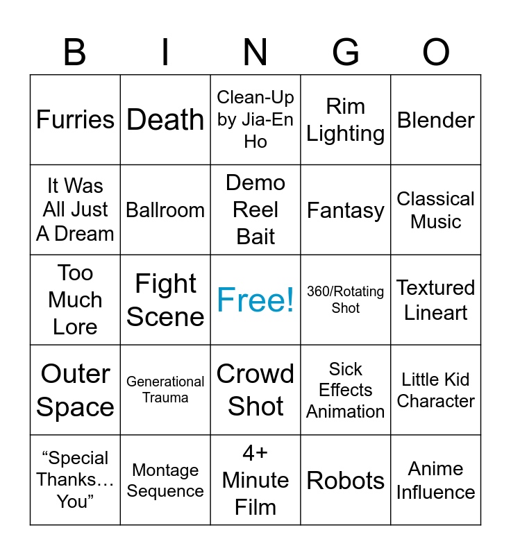 This bingo card has a free space and 34 words: Anxiety Manifestation, Robots, Ocean, 🏳️🌈, Outer Space, Ballroom, Blender, “Special Thanks… You”, Death, Marketable Plushie Character, Demo Reel Bait, Clean-Up by Jia-En Ho, Frank Gresham Cameo, Crazy Camera Movement, 360/Rotating Shot, Classical Music, Montage Sequence, Too Much Lore, Generational Trauma, Sick Effects Animation, Crowd Shot, Forest, Furries, Textured Lineart, 4+ Minute Film, Anime Influence, Rim Lighting, Newgrounds, Fantasy, It Was All Just A Dream, Snow, Fight Scene, Little Kid Character and Underwater Shot.