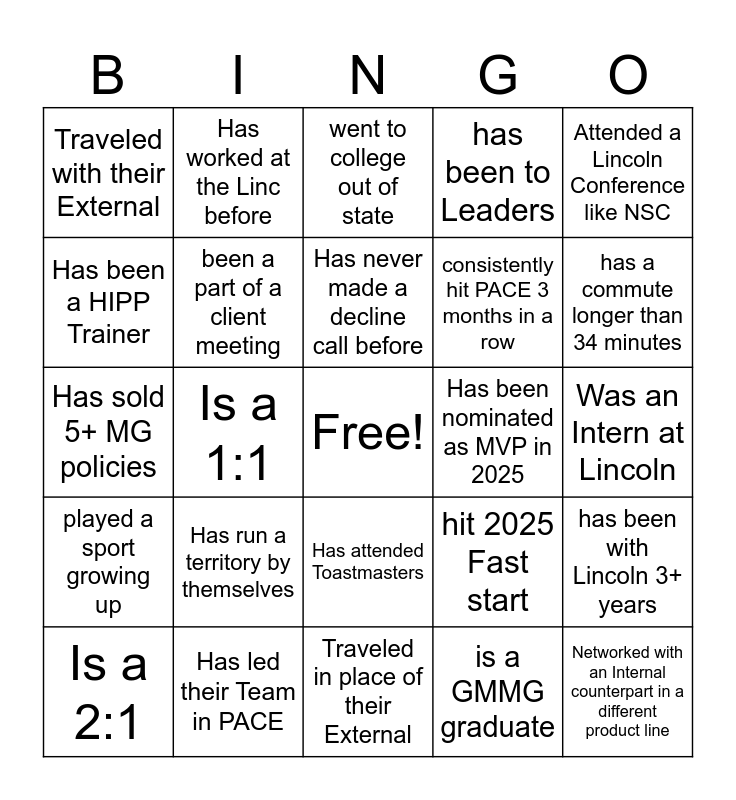 This bingo card has a free space and 24 words: Is a 2:1, Has run a territory by themselves, Has never made a decline call before, is a GMMG graduate, Attended a Lincoln Conference like NSC, Traveled with their External, Has worked at the Linc before, went to college out of state, Has been nominated as MVP in 2025, Was an Intern at Lincoln, Has sold 5+ MG policies, been a part of a client meeting, hit 2025 Fast start, has been with Lincoln 3+ years, Has been a HIPP Trainer, Has led their Team in PACE, Traveled in place of their External, has been to Leaders, has a commute longer than 34 minutes, played a sport growing up, Is a 1:1, Has attended Toastmasters, consistently hit PACE 3 months in a row and Networked with an Internal counterpart in a different product line.