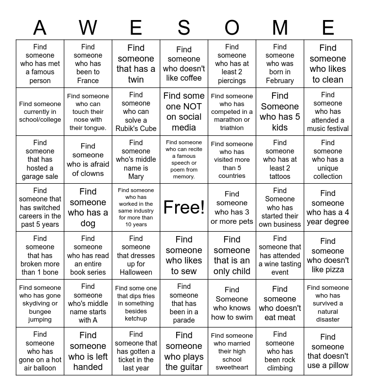 This bingo card has a free space and 48 words: Find Someone who knows how to swim, Find Someone who has 5 kids, Find someone who plays the guitar, Find someone who has a dog, Find someone who's middle name is Mary, Find someone who has a 4 year degree, Find someone who has been to France, Find someone who is left handed, Find someone who was born in February, Find someone who likes to sew, Find someone who likes to clean, Find someone who doesn't like coffee, Find someone who has at least 2 tattoos, Find someone who has visited more than 5 countries, Find someone who has gone skydiving or bungee jumping, Find Someone who has started their own business, Find someone currently in school/college, Find someone who has attended a music festival, Find someone who doesn't eat meat, Find someone who has at least 2 piercings, Find someone who has competed in a marathon or triathlon, Find someone who has worked in the same industry for more than 10 years, Find someone who has met a famous person, Find someone who can touch their nose with their tongue., Find someone who has survived a natural disaster, Find someone who can solve a Rubik's Cube, Find someone who has a unique collection, Find someone who has gone on a hot air balloon, Find someone who can recite a famous speech or poem from memory., Find someone who is afraid of clowns, Find someone who has been rock climbing, Find someone who has 3 or more pets, Find someone who doesn't like pizza, Find someone who's middle name starts with A, Find someone that has switched careers in the past 5 years, Find someone that is an only child, Find someone that has attended a wine tasting event, Find someone that has hosted a garage sale, Find someone that dresses up for Halloween, Find some one that dips fries in something besides ketchup, Find someone that has broken more than 1 bone, Find someone that doesn't use a pillow, Find someone that has a twin, Find someone that has gotten a ticket in the last year, Find some one NOT on social media, Find someone that has been in a parade, Find someone who has read an entire book series and Find someone who married their high school sweetheart.