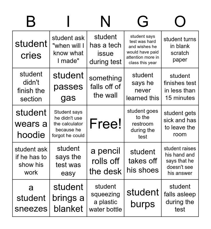 This bingo card has a free space and 24 words: student says the test was easy, student brings a blanket, something falls off of the wall, a student sneezes, student turns in blank scratch paper, student cries, student didn't finish the section, student ask "when will I know what I made", student goes to the restroom during the test, a pencil rolls off the desk, student says he never learned this, student wears a hoodie, student takes off his shoes, student raises his hand and says that he doesn't see his answer, student passes gas, student burps, student gets sick and has to leave the room, student has a tech issue during test, student finishes test in less than 15 minutes, Student says he didn't use the calculator because he forgot he could, student falls asleep during the test, student ask if he has to show his work, student says test was hard and wishes he would have paid attention more in class this year and student squeezing a plastic water bottle.