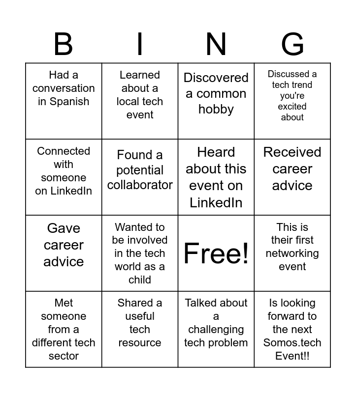 This bingo card has 16 words: Met someone from a different tech sector, Shared a useful tech resource, Discovered a common hobby, Discussed a tech trend you're excited about, Connected with someone on LinkedIn, Learned about a local tech event, Free!, This is their first networking event, Had a conversation in Spanish, Found a potential collaborator, Talked about a challenging tech problem, Received career advice, Gave career advice, Wanted to be involved in the tech world as a child, Heard about this event on LinkedIn and Is looking forward to the next Somos.tech Event!!.