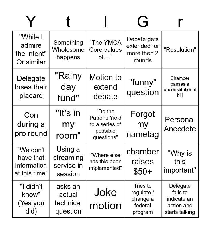 This bingo card has a free space and 41 words: Sarcastic con/pro speech, Con during a pro round, Pro during a con round, "Rainy day fund", asks an actual technical question, "Where else has this been implemented", Motion to extend debate, Delegate fails to yield time, "Resolution", "We don't have that information at this time", "It's in my room", Debate gets extended for more then 2 rounds, Delegate fails to indicate an action and starts talking, Personal Anecdote, Forgot my nametag, Using a streaming service in session, "My advisor said I can" (No you can't), "While I admire the intent" Or similar, Not leaving room for Jesus at the dance, "The YMCA Core values of....", "Why is this important", Motion to impeach or change chair, Joke motion, "funny" question, "The Honorable Chair", motions to extend debate because they didn't get called on, Tries to regulate / change a federal program, "This is unconstitutional", Chamber passes a unconstitutional bill, postpone a bill b/c of judicial review, attempt to overturn a veto, Something Wholesome happens, "I didn't know" (Yes you did), Delegate peaks out their hotel room, chamber raises $50+, Delegate loses their placard, Delegate complains about Staff, That one group of guys from a rich school, general tomfoolery (not the committee), Meme Bill and Delegate says something *truly* wild.