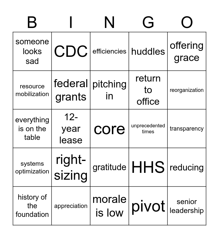 This bingo card has a free space and 24 words: right-sizing, appreciation, pitching in, history of the foundation, offering grace, someone looks sad, resource mobilization, CDC, unprecedented times, gratitude, return to office, everything is on the table, HHS, reducing, federal grants, pivot, transparency, efficiencies, reorganization, 12-year lease, senior leadership, systems optimization, huddles and morale is low.