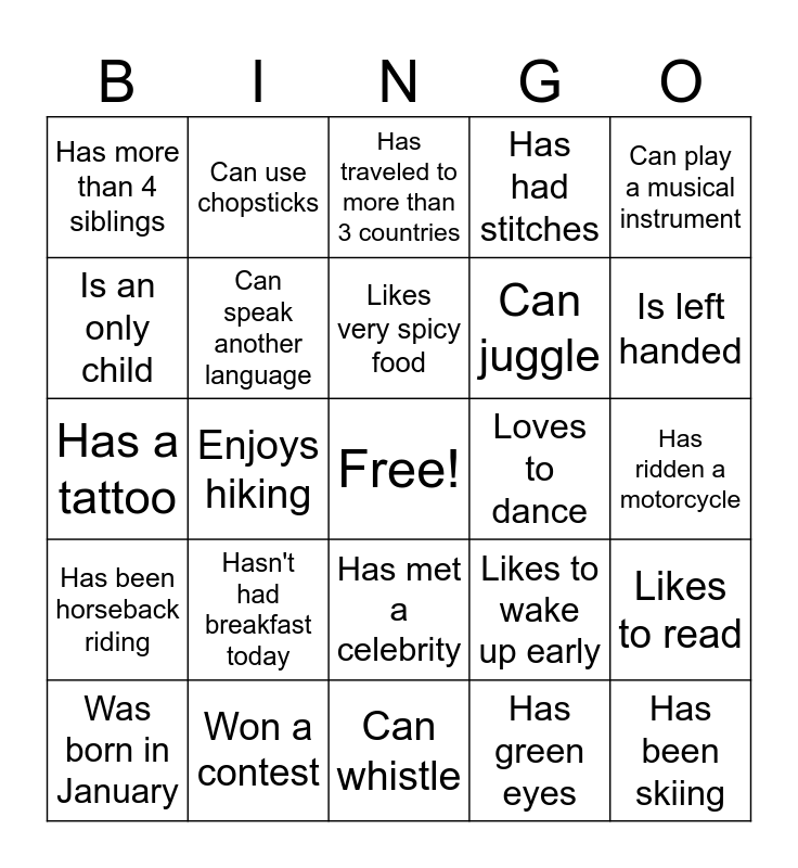 This bingo card has a free space and 24 words: Hasn't had breakfast today, Won a contest, Likes very spicy food, Was born in January, Can play a musical instrument, Has more than 4 siblings, Is an only child, Can use chopsticks, Loves to dance, Has met a celebrity, Can juggle, Has a tattoo, Likes to wake up early, Likes to read, Can speak another language, Has green eyes, Has ridden a motorcycle, Has traveled to more than 3 countries, Is left handed, Enjoys hiking, Has been skiing, Has been horseback riding, Has had stitches and Can whistle.