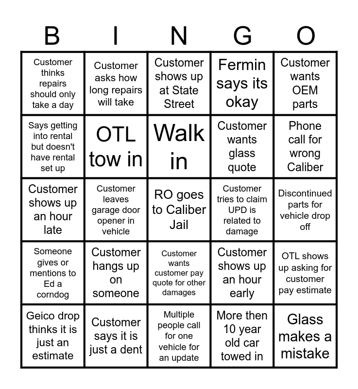 This bingo card has a free space and 24 words: Customer hangs up on someone, Customer says it is just a dent, Walk in, Geico drop thinks it is just an estimate, Customer wants OEM parts, Customer thinks repairs should only take a day, Says getting into rental but doesn't have rental set up, Customer asks how long repairs will take, Customer tries to claim UPD is related to damage, Customer wants customer pay quote for other damages, Customer wants glass quote, Customer shows up an hour late, Customer shows up an hour early, OTL shows up asking for customer pay estimate, OTL tow in, More then 10 year old car towed in, Discontinued parts for vehicle drop off, Customer shows up at State Street, Phone call for wrong Caliber, Customer leaves garage door opener in vehicle, Glass makes a mistake, Someone gives or mentions to Ed a corndog, Fermin says its okay and Multiple people call for one vehicle for an update.