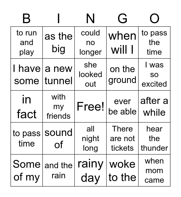 This bingo card has a free space and 24 words: sound of, and the rain, she looked out, Some of my, to pass the time, to run and play, I have some, as the big, ever be able, all night long, on the ground, in fact, There are not tickets, hear the thunder, a new tunnel, woke to the, after a while, could no longer, I was so excited, with my friends, when mom came, to pass time, when will I and rainy day.