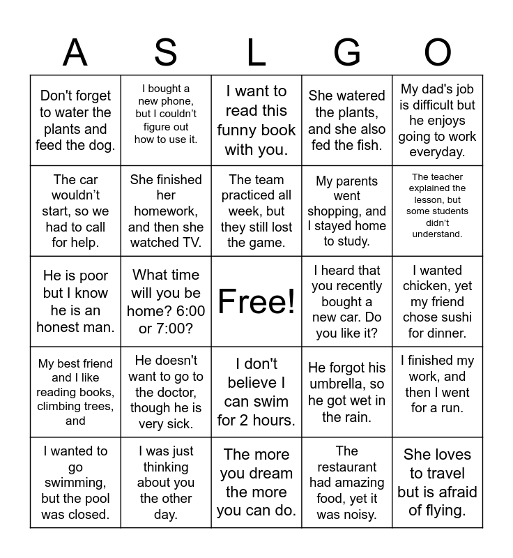 This bingo card has a free space and 29 words: I wanted to go swimming, but the pool was closed., I’m going to the library to study, or I can stay home and read., What time will you be home? 6:00 or 7:00?, I wanted to walk to the park, but it was too far away., Don't forget to water the plants and feed the dog., I want to read this funny book with you., She finished her homework, and then she watched TV., He doesn't want to go to the doctor, though he is very sick., I heard that you recently bought a new car. Do you like it?, I was just thinking about you the other day., I wanted chicken, yet my friend chose sushi for dinner., She loves to travel but is afraid of flying., The more you dream the more you can do., The restaurant had amazing food, yet it was noisy., The teacher explained the lesson, but some students didn’t understand., My dad is a chef and makes a delicious rare steak., I don't believe I can swim for 2 hours., My best friend and I like reading books, climbing trees, and, My dad's job is difficult but he enjoys going to work everyday., He is poor but I know he is an honest man., He forgot his umbrella, so he got wet in the rain., We finished our homework, but the teacher gave us more., My parents went shopping, and I stayed home to study., The car wouldn’t start, so we had to call for help., She watered the plants, and she also fed the fish., I bought a new phone, but I couldn’t figure out how to use it., I finished my work, and then I went for a run., The team practiced all week, but they still lost the game. and I wanted to buy the white dress, but it was too expensive..