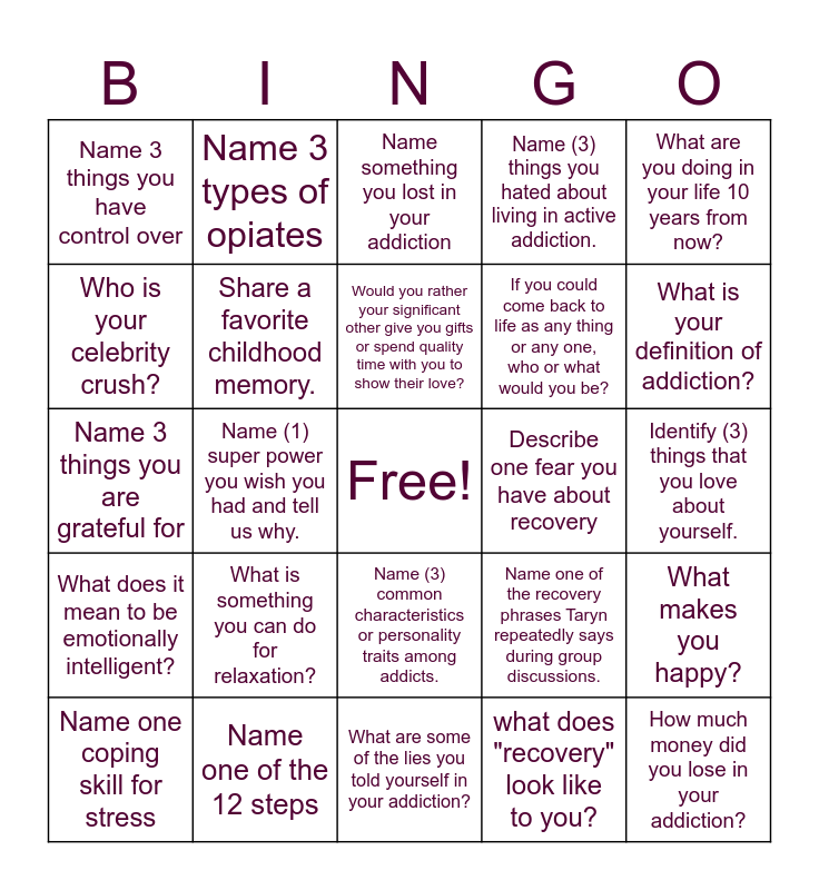 This bingo card has a free space and 44 words: What are 2 slang terms for cocaine?, How much money did you lose in your addiction?, Name 2 of your triggers, Name one coping skill for stress, Share a positive affirmation you can tell yourself daily., what does "recovery" look like to you?, Name something you lost in your addiction, How many days clean do you have?, What are you doing in your life 10 years from now?, Name one of the 12 steps, Name (3) things you hated about living in active addiction., Describe one fear you have about recovery, Name (3) common characteristics or personality traits among addicts., What is something you can do for relaxation?, What parts of the body are affected by alcohol use?, What are some of the lies you told yourself in your addiction?, What is your favorite thing about being clean? (if you aren't clean, you don't get to answer this- no BINGO for you), Name 3 things you are grateful for, Name 3 things you have learned about yourself this year., What is your definition of addiction?, Name 3 types of opiates, How many times have you experienced relapse and/or overdose?, Name 2 emotions that are triggers for you, Name 3 things you have control over, Name one self-care activity you enjoy., Identify (3) things that you love about yourself., What is one thing that you struggle to forgive yourself for doing in active addiction?, Tell another group member something you respect or appreciate about them., Name one of the recovery phrases Taryn repeatedly says during group discussions., What does it mean to be emotionally intelligent?, Share your favorite recovery and/or worship song., What makes you happy?, Describe your addiction in one word., Velveeta or Kraft Mac and Cheese?, Name (1) super power you wish you had and tell us why., If you could live anywhere in the world, where would it be?, When did you know that your habits had turned into an addiction? (Do you remember losing control?), What is your favorite physical attribute about yourself?, Would you rather your significant other give you gifts or spend quality time with you to show their love?, Who is your celebrity crush?, If you could come back to life as any thing or any one, who or what would you be?, What is your favorite holiday?, Share a favorite childhood memory. and Name (3) traits you value in a best friend or significant other, etc..