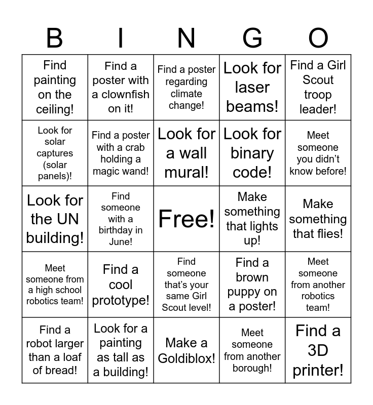 This bingo card has a free space and 24 words: Find a cool prototype!, Look for a painting as tall as a building!, Look for a wall mural!, Find a robot larger than a loaf of bread!, Find a Girl Scout troop leader!, Find painting on the ceiling!, Look for solar captures (solar panels)!, Find a poster with a clownfish on it!, Make something that lights up!, Find someone that’s your same Girl Scout level!, Look for binary code!, Look for the UN building!, Find a brown puppy on a poster!, Meet someone from another robotics team!, Find a poster with a crab holding a magic wand!, Meet someone from another borough!, Make something that flies!, Find a poster regarding climate change!, Meet someone you didn’t know before!, Find someone with a birthday in June!, Find a 3D printer!, Meet someone from a high school robotics team!, Look for laser beams! and Make a Goldiblox!.