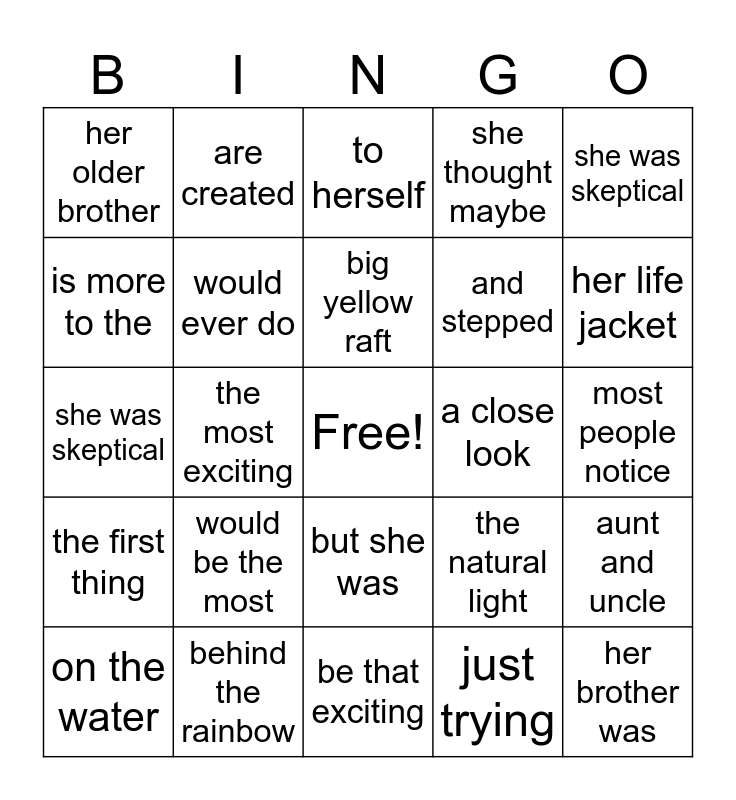 This bingo card has a free space and 24 words: would be the most, behind the rainbow, big yellow raft, on the water, she was skeptical, her older brother, is more to the, are created, a close look, but she was, and stepped, she was skeptical, the natural light, aunt and uncle, would ever do, just trying, most people notice, to herself, her life jacket, the most exciting, her brother was, the first thing, she thought maybe and be that exciting.
