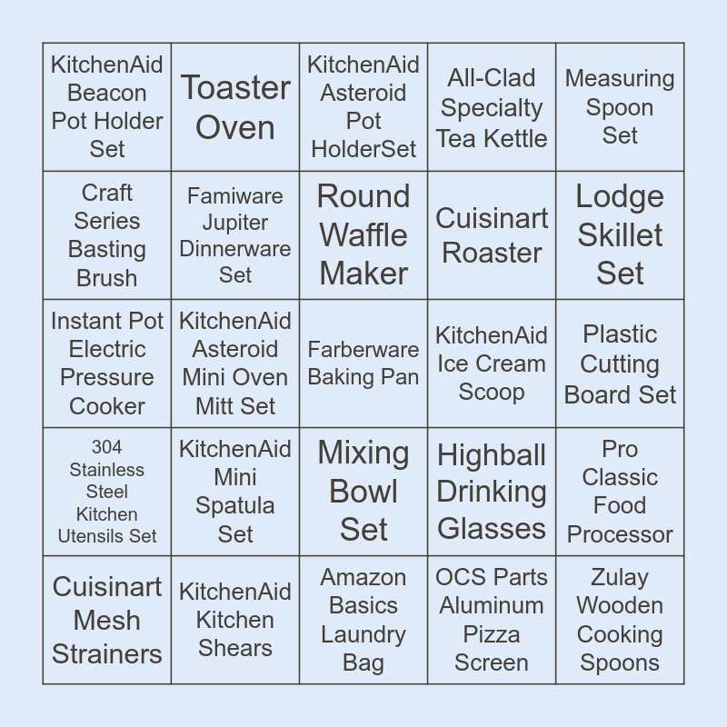 This bingo card has 65 words: Artisan Series Stand Mixer, Chef's Classic Cookware Set, Portola Flatware Set, Pro Classic Food Processor, Self-Sharpening Knife Block Set, Gatwick Dutch Oven, Toaster Oven, Glass Storage Container Set, Round Waffle Maker, Le Creuset Stainless Steel Measuring Cups, Mixing Bowl Set, Stoneware Baker Set, Plastic Cutting Board Set, Measuring Spoon Set, All-Clad Woven Striped Hand Towels, Craft Series Basting Brush, KitchenAid Asteroid Mini Oven Mitt Set, KitchenAid Beacon Pot Holder Set, All-Clad Dual-Purpose Kitchen Towels, Cuisinart Roaster, KitchenAid Mini Spatula Set, 304 Stainless Steel Kitchen Utensils Set, All-Clad Specialty Tea Kettle, Sumnacon Cast Iron Trivet, Yopay Cast Iron Trivet, Cuisinart 12-Quart Skillet, Stockpot, Cuisinart Griddle Skillet, Sweejar Glass Pie Pan, Farberware Baking Pan, P&P CHEF Angel Food Cake Pan, Cuisinart Mesh Strainers, OXO Salad Spinner, Fayomir Cookie Scoop Set, Nordic Ware Better Batter Bowl, Highball Drinking Glasses, KitchenAid Kitchen Shears, TOURIT Cooler Backpack, Instant Pot Electric Pressure Cooker, OCS Parts Aluminum Pizza Screen, KitchenAid Nylon Slotted Turner, Famiware Jupiter Dinnerware Set, Vuudh Casserole Carrier Bag, KitchenAid Ice Cream Scoop, KitchenAid Food Chopper, KitchenAid Plastic Prep Bowls, Pyrex Glass Measuring Cups, Lodge Skillet Set, Pyrex Glass Mixing Bowls, Zulay Wooden Cooking Spoons, HexClad Nonstick Fry Pan Set, KitchenAid Albany Kitchen Towels, KitchenAid Asteroid Oven Mitt Set, CorningWare Ceramic Bakeware Set, Amazon Basics Laundry Bag, Rattan Napkin Holder, Cuisinart Chef's Universal Steamer, ExcelSteel Colander, KitchenAid Asteroid Pot HolderSet, Paper Towel Holder, Farberware GoldenBake Baking Pans Set, HiCoup Wine Opener, Hoomey Blue Marble Coasters, Fox Run Rolling Pin, KitchenAid Whisk and Wilton Excelle Fluted Tube Pan.