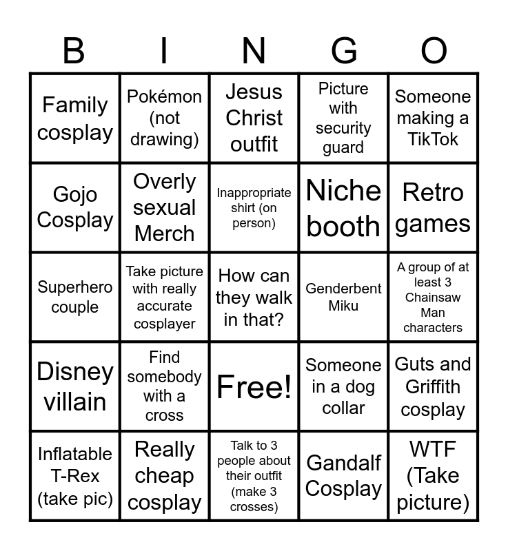 This bingo card has 26 words: Free!, Gandalf Cosplay, Inappropriate shirt (on person), Really cheap cosplay, Someone making a TikTok, Family cosplay, Gojo Cosplay, Pokémon (not drawing), A group of at least 3 Chainsaw Man characters, Someone in a dog collar, Niche booth, Superhero couple, Guts and Griffith cosplay, Inflatable T-Rex (take pic), Take picture with really accurate cosplayer, Anime or show inspired snacks or food, Picture with security guard, Disney villain, Jesus Christ outfit, How can they walk in that?, Retro games, Talk to 3 people about their outfit (make 3 crosses), Genderbent Miku, Find somebody with a cross, Overly sexual Merch and WTF (Take picture).