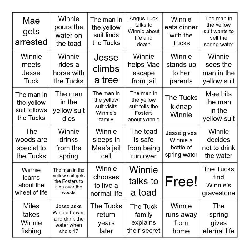 This bingo card has 37 words: Free!, Winnie talks to a toad, Winnie runs away from home, Winnie meets Jesse Tuck, Winnie drinks from the spring, The Tucks kidnap Winnie, Winnie rides a horse with the Tucks, The Tuck family explains their secret, Winnie eats dinner with the Tucks, Miles takes Winnie fishing, Winnie sees the man in the yellow suit, Angus Tuck talks to Winnie about life and death, The man in the yellow suit follows the Tucks, The man in the yellow suit visits Winnie’s family, The man in the yellow suit wants to sell the spring water, The man in the yellow suit tells the Fosters about Winnie, The man in the yellow suit gets the Fosters to sign over the woods, The man in the yellow suit finds the Tucks, Mae hits the man in the yellow suit, The man in the yellow suit dies, Mae gets arrested, Winnie helps Mae escape from jail, Winnie sleeps in Mae’s jail cell, Jesse gives Winnie a bottle of spring water, Jesse asks Winnie to wait and drink the water when she's 17, Winnie decides not to drink the water, Winnie pours the water on the toad, The Tucks return years later, The Tucks find Winnie’s gravestone, Winnie chooses to live a normal life, The Tucks leave town, The toad is safe from being run over, Winnie stands up to her parents, Winnie learns about the wheel of life, The woods are special to the Tucks, Jesse climbs a tree and The spring gives eternal life.